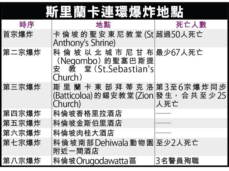 印度洋島國斯里蘭卡,昨日在復活節期間發生連環炸彈襲擊案,首都科倫坡(Colombo)及附近兩個城巿共三座教堂、四間酒店及一處民宅,昨早開始先後發生爆炸案,其中三宗爆炸疑是自殺式炸彈襲擊。連串恐襲,至昨晚已造成至少207人死亡,另有470人受傷,當中35名死者為外國人,罹難者包括2名譚姓中國公民,另有4名中國人受傷。當局其後鎖定疑兇,派出特警到一處民宅搜捕,對方反抗並引爆炸彈,造成3名警員殉職,而警方最後拘捕了7人,懷疑與案有關。另外,當局宣布實施宵禁,並暫時禁止使用社交網絡。