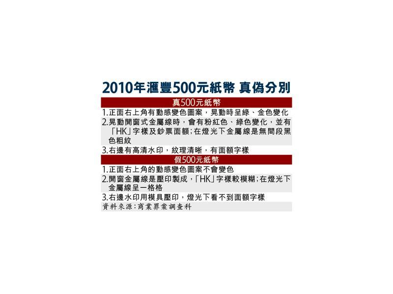 商罪科署理總督察謝家倫昨日指出,面值500元紙幣真鈔,其正面右上角有一個動感變色圖案,搖晃時會呈綠、金色變化,亦會看到有紋理移動;紙鈔上設有開窗式金屬線,搖晃時會有粉紅、綠色轉變,亦會有明顯的「HK」字樣,及鈔票的面額,放在燈光下觀察,金屬窗是一條無間段的黑色粗紋;紙鈔右邊亦有高清水印,紋理清晰,隱約印有面額;真鈔是用油墨印製,摸上獅子頭會呈凹凸感。