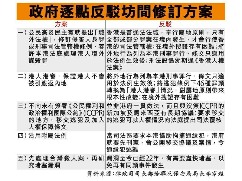 現時坊間有多個處理移交逃犯的反建議,民主黨立法會議員尹兆堅及公民黨楊岳橋早前分別提出,可修訂刑事司法管轄權條例及侵害人身罪,容許本港法庭處理港人境外干犯謀殺或誤殺罪。鄭若驊昨日表示,香港是普通法法域,奉行屬地原則,只有全部或部分罪案在境內發生,才會行使香港的司法管轄權,若以域外案件處理,在境外搜證亦有困難;而且將外地行為列為本港刑事罪行,條文只適用於法例生效後,不能處理台灣殺人案;若刑法設追溯期,亦違《香港人權法案》。
