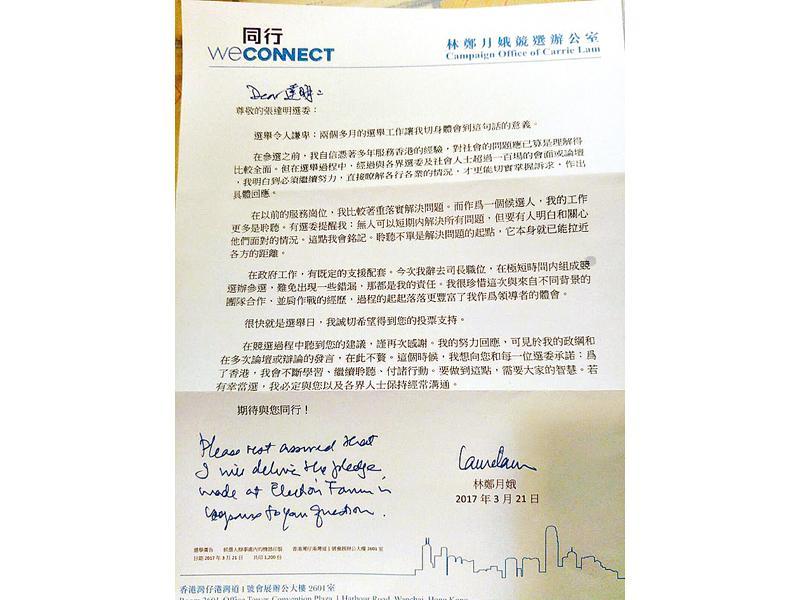 【本報港聞部報道】政府建議修訂《逃犯條例》,中聯辦日前為此接見大批建制派,有與會者事後更引述中聯辦主任王志民稱「修例一定要成功通過」,引發社會對政府與中聯辦、即「中西環同行」的憂慮。身兼法律界選委的香港大學法律學院首席講師張達明昨日在社交網站上傳照片,顯示林鄭月娥在2017年一場特首選舉論壇後給他一封親筆信,信中表明自己不會要求中聯辦替她於立法會拉票,現在令張達明慨嘆:「她還可以信守這承諾嗎?」