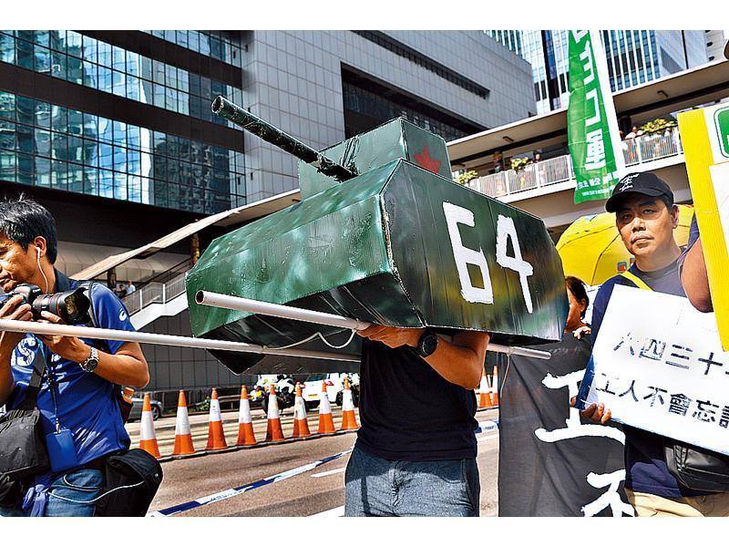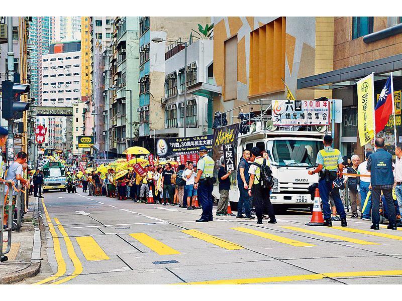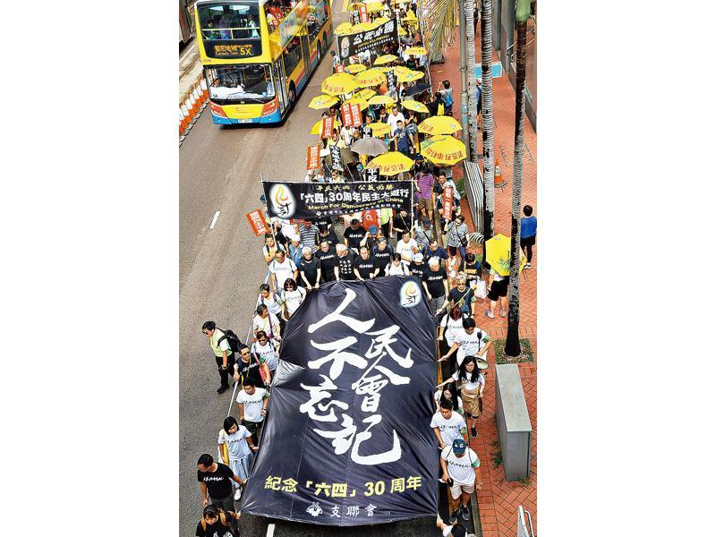支聯會昨午3時舉行「人民不會忘記──平反六四!公義必勝!」遊行,由灣仔修頓球場出發,遊行至中聯辦。支聯會副主席蔡耀昌出發前表示,港人多年來風雨不改,一步一腳印參與「六四遊行」,是香港堅定爭取民主的最佳印記。他引用魯迅在《故鄉》的一句話,「其實地上本沒有路,走的人多了,也便成了路」,勉勵港人要繼續追求民主。遊行隊伍沿途高叫「結束一黨專政」等口號,有市民自製坦克道具,批評當年北京政府出動坦克對付手無寸鐵的學生,遊行期間不時有愛國團體或親中人士指罵遊行人士,雙方互有口角,需警方調停。
