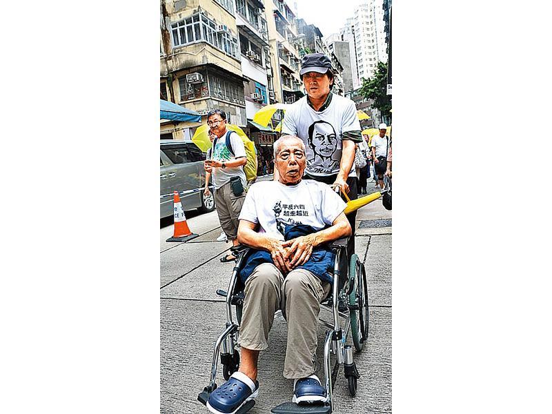 今年82歲的黃伯由義工推輪椅上街,他稱,去年確診患上癌症第四期,安老院職員及兒子都有勸他不要出席遊行,但自己30年來都有為支聯會做義工,堅持要年年出席,「即使我患癌,都要『平反六四』,行得一步得一步」。他慨嘆,近年不少年輕人都認為「六四事件」與香港無關,對此深感惋惜,呼籲港人要出席「六四集會」,毋忘「六四」。