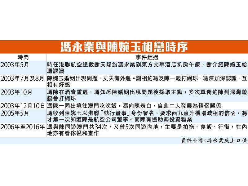 至2003年12月10日,他和陳到澳門吃晚飯長達3小時、主要是他向陳表白,由於他有家室、不想被人撞到、所以陳建議去澳門。他當時不知道陳是港聯直升機的董事,他們一起不會談公事,表白後大家開始拍拖。兩人在長達10多年的拍拖中,先後34次一起去澳門,5次返內地吃飯行街或者看傢私或欣賞畫作。馮形容陳對他「好好、好溫柔,好好,以她的身份,從没有要求我在時間或名分上有任何要求」。