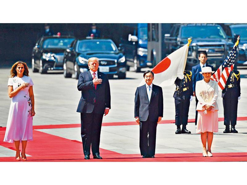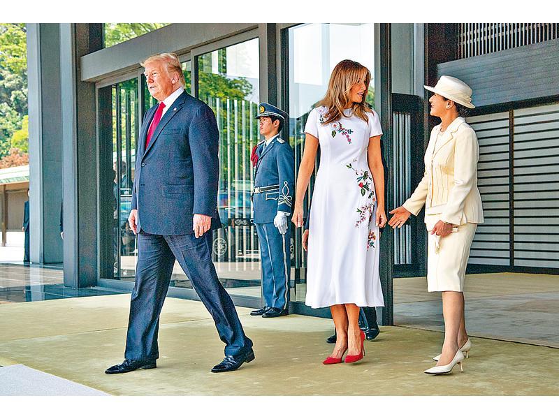 特朗普與夫人梅拉尼婭昨日繼續第三天的訪日行程,焦點落在與日皇德仁的會面。日本時間昨早9時20分左右,日皇德仁在皇居「竹之間」為特朗普舉行歡迎儀式,特朗普成為令和時代的首到訪國賓。日皇夫婦用英語向特朗普夫婦打招呼,隨後在東庭舉行歡迎儀式,特朗普檢閱陸上自衛隊儀仗隊。日本宮內廳指出,日皇夫婦之後在「竹之間」接見了特朗普夫婦,會談約15分鐘。前晚看了大相撲的特朗普向日皇表示:「(大相撲)感覺很有力,非常棒。」日皇回應稱:「我沒有在總統觀看的那麼近處看過。」