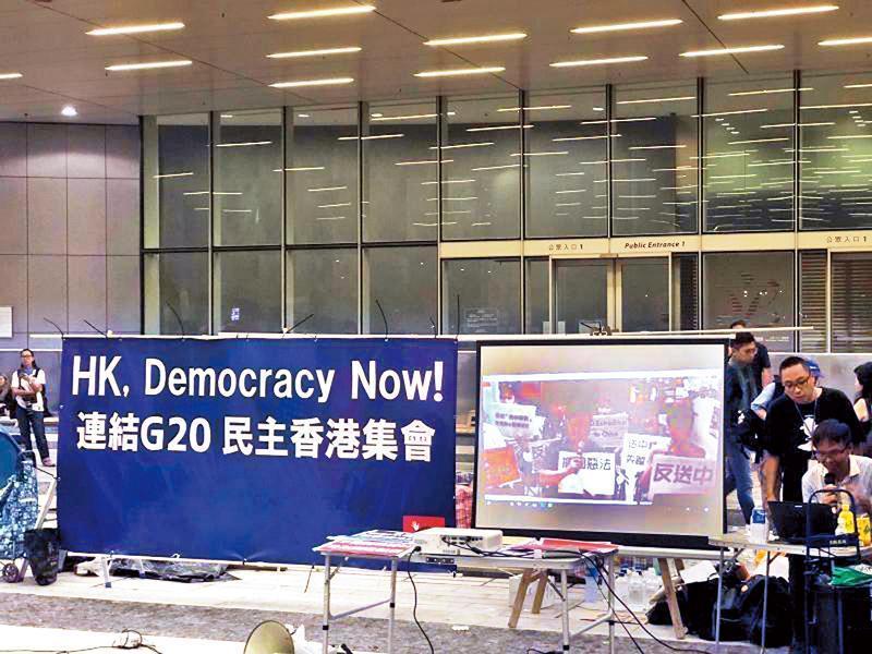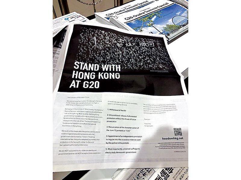 【本報港聞部報道】坊間冀趁二十國集團(G20)峰會正在日本大阪舉行,透過在各國報紙刊登廣告引起國際社會關注。有組織昨晚在立法會示威區舉行集會,表明是「連結G20」,而日本、韓國、法國等報章則陸續刊出相關廣告。