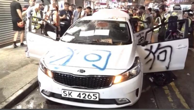 晚上近7時,一輛停泊於登打士街近彌敦道的白色私家車被暴徒擊碎車窗,並以噴漆噴上「狗車」及「狗」字眼,塗污車身。有人在車尾箱搜獲一個印有警徽及寫上「鑑證科」的膠盒、反光衣及索帶等物品,相關物品其後被散落車內的地上。