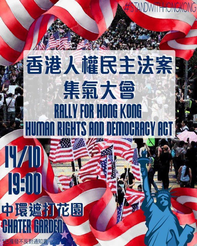 「香港人權民主法案集氣大會」今晚7時在中環遮打花園舉行,而根據「不反對通知書」,集會有效時限由今日下午3時起,直至晚上10時30分,大會預計將有2,000人參加,主辦方要安排至少30名糾察在場維持秩序。大會指出,周六(12日)與警方會面時,警方提醒要呼籲屆時的糾察以至出席集會的人士,均不可蒙面,而大會亦會提醒各參與者有關法例的要求和風險。根據《禁蒙面法》,即使是合法的集會遊行,現場人士也不能蒙面或以其他方式遮蓋容貌,否則便屬違例,最高可罰款2.5萬元及入獄一年。
