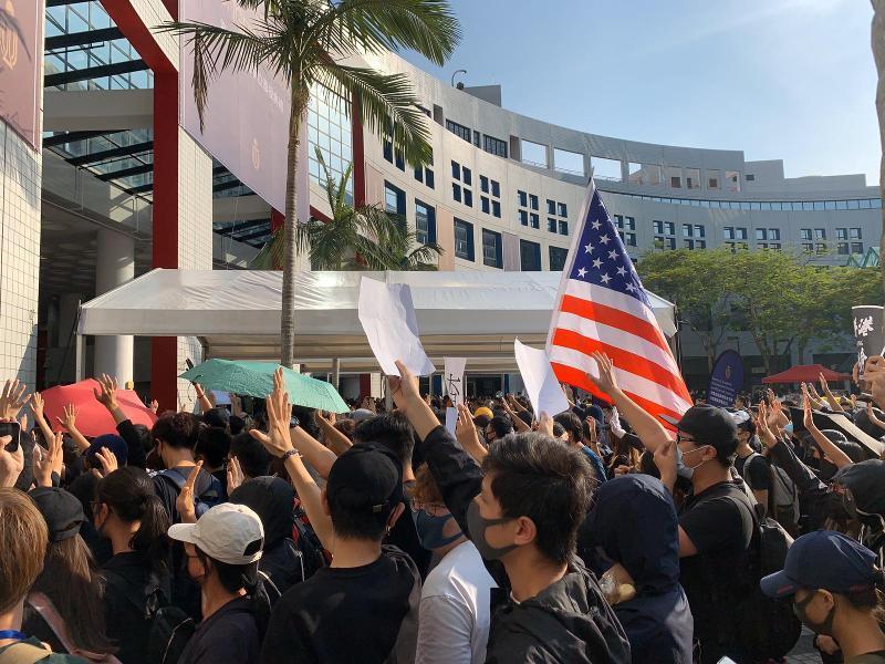 科大昨日舉行畢業禮,頒授商學院及人文社會科學學院學位,上午10時30分多名學生身穿黑衣及戴上口罩,拿着有關周梓樂在將軍澳墮樓的單張在會場外默站。在畢業禮播放國歌時,有在場人士唱反修例歌曲《願榮光歸香港》,場內則有人高叫「光復香港,時代革命」的口號。至於在下午的畢業典禮,有一批身穿黑衣的科大學生衝上主禮台,高舉聲援周梓樂的標語,約10分鐘後才離開主禮台。學生大叫「周同學加油」的口號,又向台下家長致歉,表示「阻到你們對不起」。