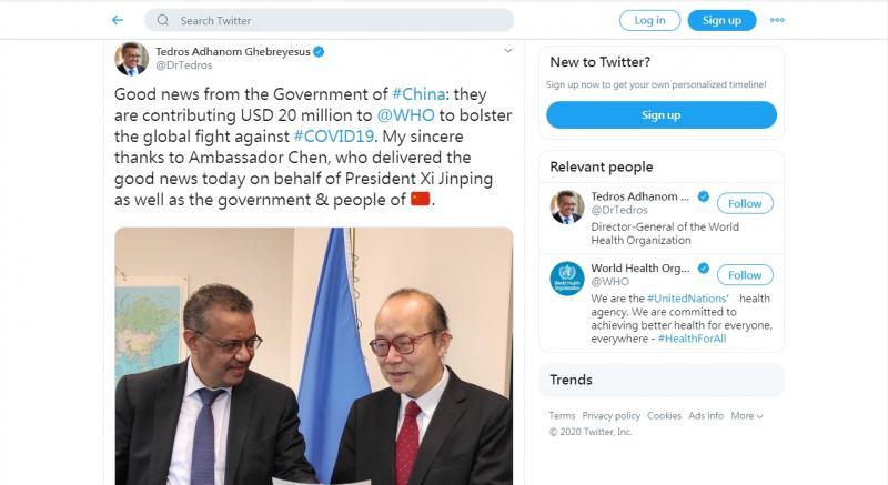 正當國際社會質疑世衞未有做好把關工作,世衞似乎只把着眼點放在金錢之上。譚德塞昨日在社交網站Twitter帖文中指出:「來自中國的好消息,他們要對世衞組織貢獻2,000萬美元協助全球對抗疫情。誠摯感謝代表中國國家主席習近平捐款的陳旭大使(中國常駐聯合國日內瓦辦事處和瑞士其他國際組織代表團特命全權大使)。謝謝中國政府與人民。」至於中方表示,自疫情以來,世衞在譚德塞領導下,推動各國加強防範意識、堅持科學理性應對、幫助有關國家提升衞生體系能力發揮了重要作用,中方高度讚賞世衞理解和支持中國防控工作,今次捐款是響應世衞的呼籲,以實際行動支持世衞繼續在抗擊疫情的國際行動中更好發揮協調作用。