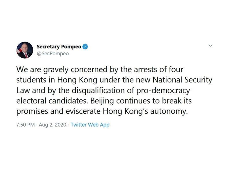 蓬佩奧在社交網站貼文,表示嚴重關切香港當局以「港區國安法」拘捕學生動源前召集人鍾翰林等4名學生,以及取消民主派人士參與立法會選舉的資格,蓬佩奧批評北京繼續違背承諾,蠶食香港的自治。
