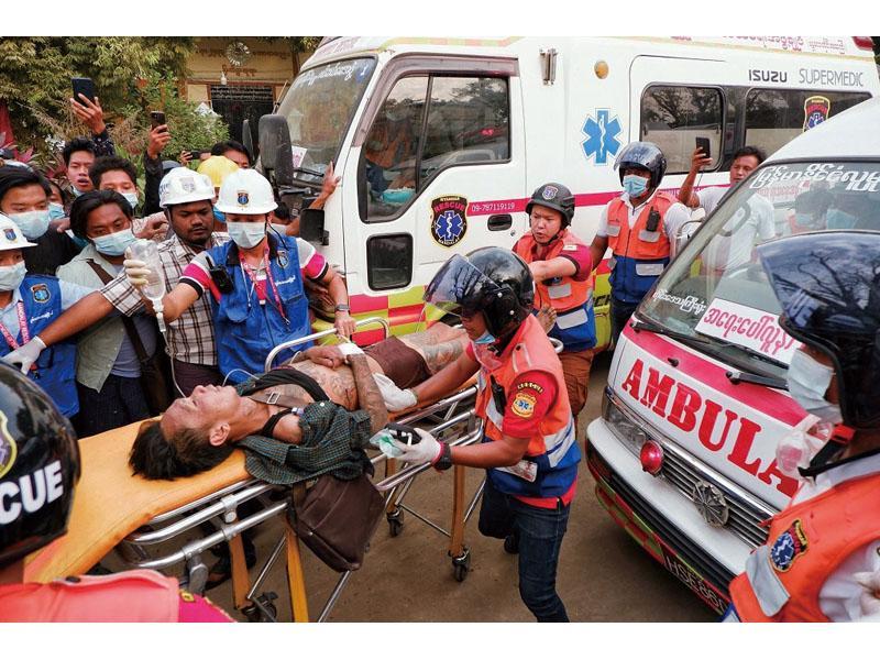 曼德勒鎮壓後,一名傷者被抬到醫院。