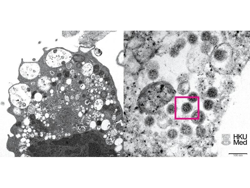 另外,香港大學醫學院昨公布照片,研究人員將病毒注入細胞,電子顯微鏡下Omicron跟以往如Delta等變種病毒株一樣,在相同位置攻擊細胞,未有進一步證據顯示Omicron威力有增強。港大醫學院將Omicron注入猴腎細胞(Vero E6),攻毒後以低倍電子顯微鏡所見,細胞受損,腫脹囊泡,囊泡內含有黑色小病毒顆粒;高倍電子顯微鏡就反映病毒顆粒表面呈現皇冠形的刺突蛋白。