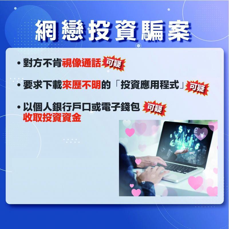 蕭澤頤表示,騙徒手法層出不窮,市民大眾一不留神就墮入陷阱,遭受損失。他舉例,其中一名受害人經「通訊軟件」認識聲稱為「金融才俊」的騙徒,受害人誤信騙徒噓寒問暖的甜言蜜語,在從未見面下墮入愛河,騙徒取得信任後隨即誘騙受害人下載一個虛假應用程式進行投資,受害人不虞有詐,先後多次轉款共1,800萬元。