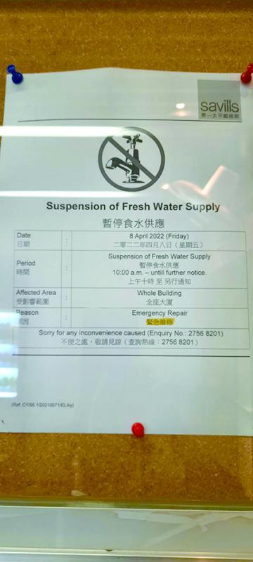 泉源工業大廈位於牛頭角,今年4月初,食水突然暫停,根據大廈張貼的告示,原因是「緊急維修」。大廈內上班的市民頓時無法洗手,在疫情下,影響不可謂不大,而如要取水,則要走到數百米外的街喉。時至翌日,食水繼續暫停,詎料鹹水亦隨之暫停,代表沖廁亦受影響。據了解,今次停水是受大廈附近水管滲漏有關,而停水多時,是由於水務署暫時未能找到滲漏的確實位置。整個停水過程歷時大約兩天。 |