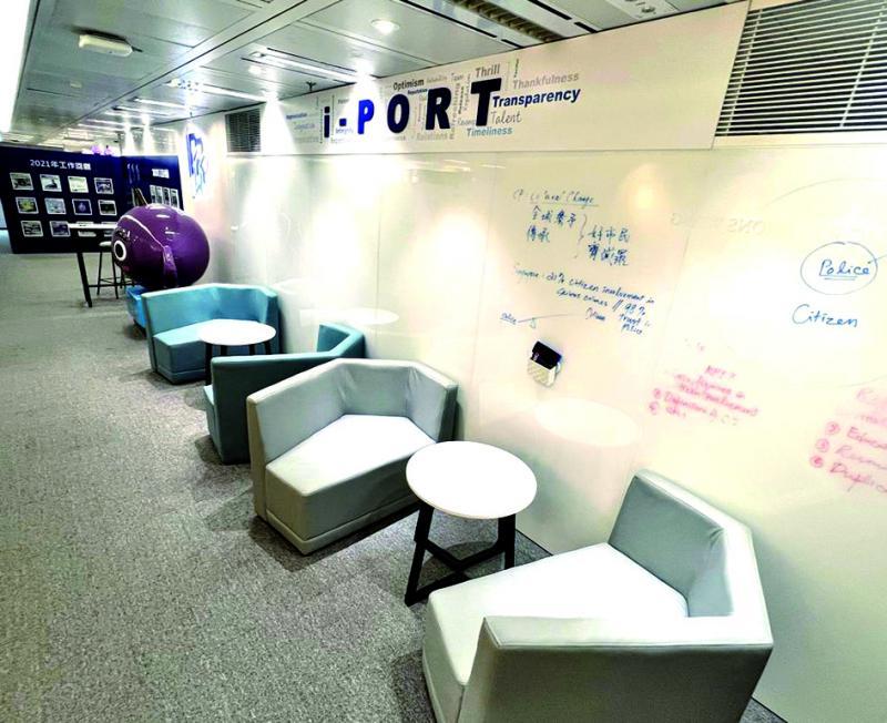 此外,办公室亦增设创意讨论空间「i-PORT」,让参观人士在舒适的环境中,了解部门工作及讨论合作项目。在「i-PORT」下的巨型白板可画图写字,当白板使用,当公共关係部的人员坐在这里可以轻轻松松开会,「脑震盪」一下,撞出更多新奇构想及大计。成仔自然多望两眼有何「秘密行动」,答案是白板写上「好市民‧齐灭罪」之类。访客可坐在这里,与公共关係部交流意见,这张相当然要拍摄啦!