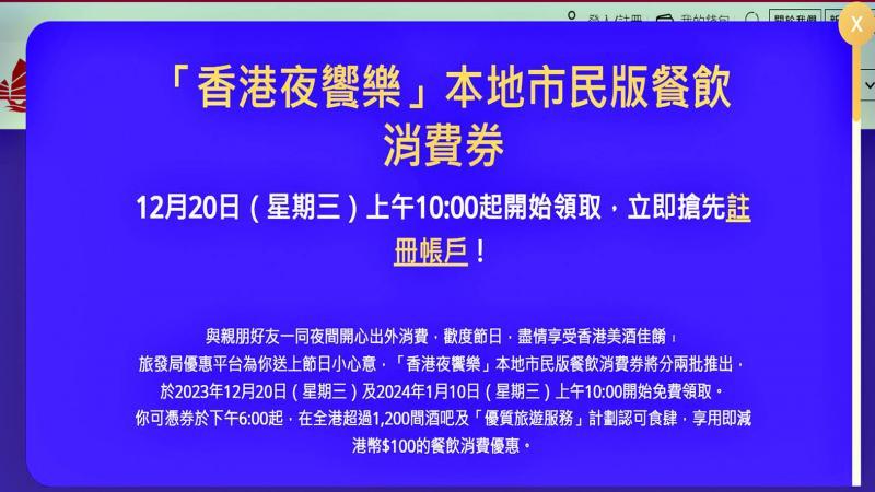 首批10萬張「香港夜饗樂」本地市民版餐飲消費券,將在下周三早上10時起,在旅發局網站,以先到先得形式派發,至於第二批同樣為數10萬張的餐飲消費券,則會在下月10日派發。旅發局說,本地市民即時起,可於Discover Hong Kong 網站的電子平台預先註冊登記帳戶。