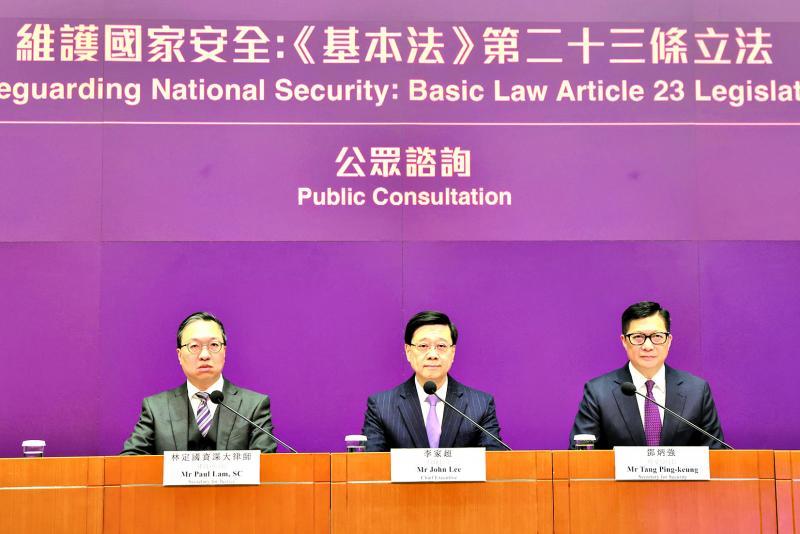 保安局局長鄧炳強在記者會上闡述《基本法》第23條立法公眾諮詢的內容,指大部分與罪行有關的建議屬完善現行法例,此外,當局也按香港特區的實際情況和需要新增一些罪行,以有效防範、制止和懲治各類危害國家安全的行為和活動。