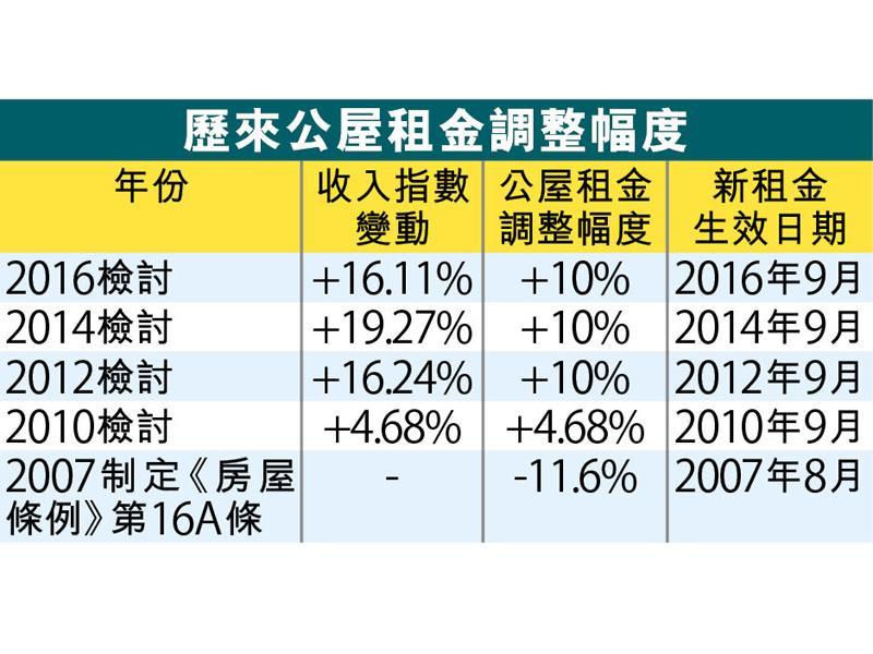 消息稱房委會設有加租「封頂」機制,故是次租金調整將會增加加租上限的10%。例如2012年、2014年及2016年租金檢討中,租戶家庭收入分別增加了16.24%、19.27%及16.11%,累積之下,公屋租戶整體收入從2007年至2017年增加88%,惟租金累計只上升53.3%。家庭收入與租金的比例,由2007年的9.97%逐漸下降至按是次檢討上調租金後的9.14%。暫時未有計劃檢討現行的租金調整機制。