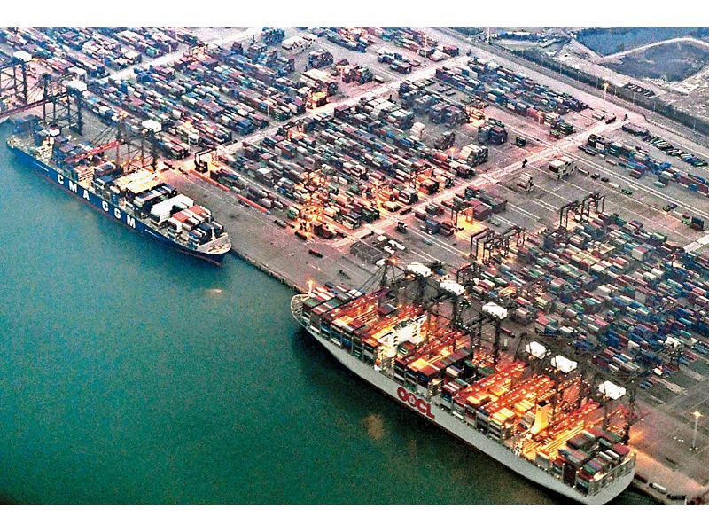 兩艘貨輪在廈門港口裝卸貨物。