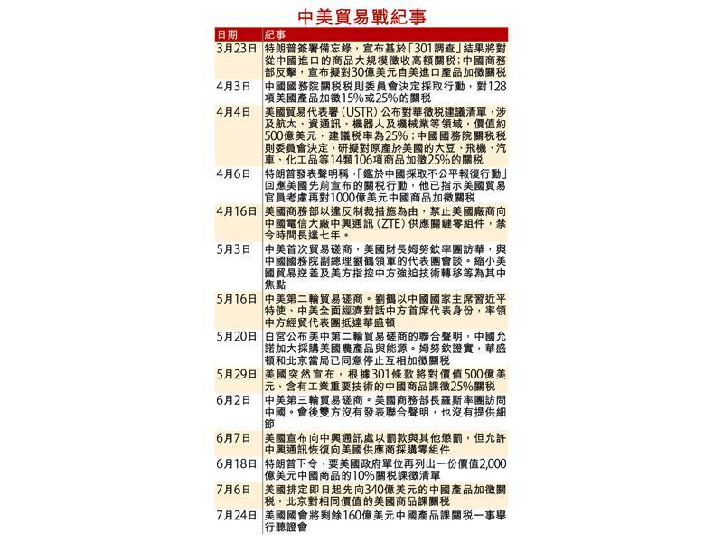 美國貿易代表署(USTR)上月15日宣布分兩階段對中國價值500億美元的產品課徵25%關稅,昨日實施的首階段關稅針對價值340億美元、818個項目的中國進口產品,鎖定航天、資訊科技、汽車零件和醫療器材等產業,之後還會出第二階段160億美國284個項目產品採取關稅行動。