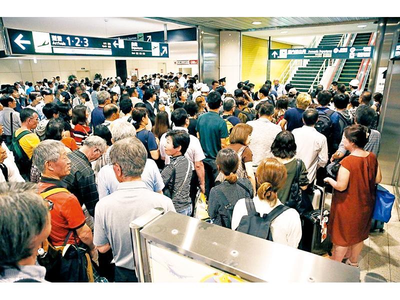 新千歲機場昨早擠滿旅客,等待內陸線航班復飛。
