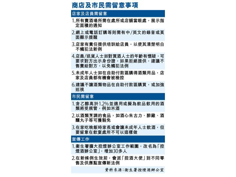 衞生署控煙酒辦公室主管李培文昨日在記者會上表示,首先即場出售酒品的場所,必須在當眼處展示最少為38厘米乘20厘米的中英文通知,而遙距分發中,網上商店需以合理且清晰可閱的方式展示,如電話訂購則需以錄音或口頭讀出訂明通知,網頁訂購則需在頁面顯示通知。店家及店員需確保所酒類售賣的對象為非18歲以下人士,便利店、超市等零售店,如對賣方的年齡有所懷疑,可要求其出示身份證,但因法例無授權店方必須查閱,對方亦可拒絕。為免娛墮法網,他建議店家可不向其售賣。