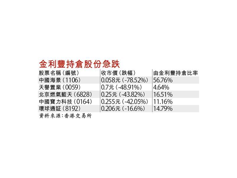 「金利豐」持倉的五隻股票,分別是中國海景(1106)、天譽置業(0059)、北京燃氣藍天(6828)、中國寶力科技(0164),以及環球通証(8192)。根據中央結算系統(CCASS)資料,「金利豐」在海景、寶力及北京燃氣的持倉,分別達56.78%、11.16%及16.52%;另一中資行海通證券在天譽與寶力的持倉分別達54.59%及58.77%。
