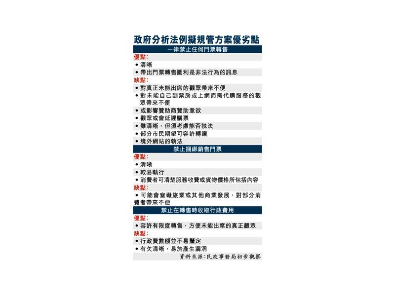 目前的香港法例第172章《公众娱乐场所条例》规定,无获授权不可以在场地通道以高于原价售卖门票,否则违法,最高罚款2,000元,但并不涵盖康文署场地。文件提出,当局会与律政司及其他执法部门继续考虑是否可修订该条例,以打击「黄牛党」,但又称「这项修订看似直接,但我们必须确保修订的内容属于该条例的范畴,并须审慎考虑《公众娱乐场所条例》是否合适用于处理有关问题」。文件又列出多项需要考虑的问题,包括一旦立法,其他于康文署场地的售票活动,例如宗教活动等门票的转售,日后亦有可能受法例规管;以及部分未满座的节目同样或受影响。政府亦探讨立法规管炒卖「黄牛票」,但由于涉及刑事,所以要审慎考虑,要研究法律及执行上较稳妥方案,明年第三季后再向立法会匯报。