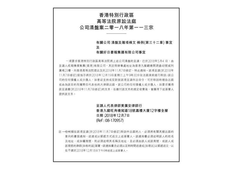 根據成報傳媒集團(香港)有限公司於今年5月4日向高等法院提交清盤呈請書指出,債權人成報傳媒集團(香港)有限公司與「好日書報集運有限公司」訂立書面的分銷協議,「好日書報集運有限公司」由2015年4月1日起為呈請人分發報章及雜誌,為期兩年;儘管分銷協議於2017年3月30日到期,但該公司繼續根據分銷協議為債權人分發報章及雜誌,直至2017年10月23日。