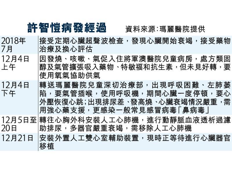僅得13個月大的男嬰許智愷,急需換心續命。小智愷與其兄長一樣患有罕見的有限制性心肌病,哥哥只活了7個月便離開世界,他去年7月心臟亦開始衰竭,現要靠外置人工雙心室輔助裝置維持生命,瑪麗醫院心胸外科部門主管區永谷指出,小智愷是年紀最小的求心者,其肝腎功能已日漸衰竭,急需O型血的屍心,而其父母希望兒子能獲得新生,可以帶其去看看這個世界。 本報港聞部報道