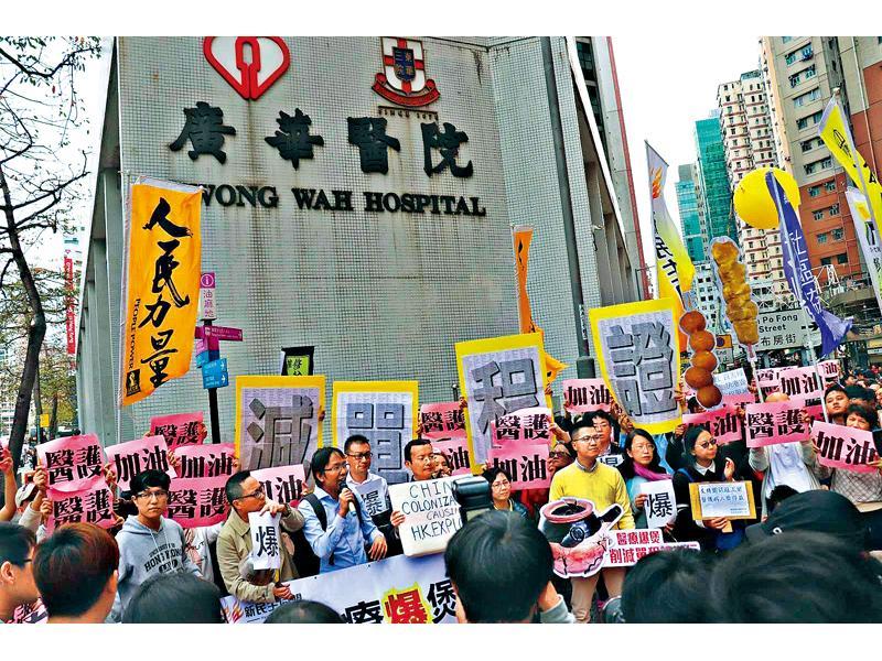 逾百名市民,在團體帶領下,昨午在旺角遊行,更手執多個標語,包括寫上「減單程證」、「醫護加油」等字句,期間又有市民帶來瓦煲,沿途更敲擊煲具,寓意醫療系統已經「爆煲」,他們浩浩蕩蕩由西洋菜南街出發,途經廣華醫院,為醫護人員打氣,再遊行至旺角政府合署。有出席遊行的精神科護士反映,公立醫院出現「床貼床」情況,甚至有長者病床要放置在通道邊,場面令人心酸。她強調自己並非歧視新移民,只是希望不要再加重醫護人員的壓力。