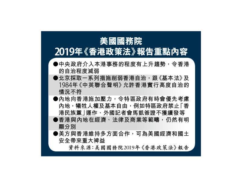 美國維持對香港獨立關稅區的特殊待遇,但同時指出北京介入本港事務的情況有所增加,削弱香港的自治程度。美國國務院發表2019年《香港政策法》報告,指出中央政府向香港施加壓力,令特區政府有時需要優先考慮內地的看法,而犧牲了人權及部分基本自由,例如禁止「香港民族黨」運作;外國記者會第一副主席馬凱不獲續發工作簽證;工黨劉小麗去年不獲准參與立法會九龍西補選等。特區政府發言人表示,外國政府不應以任何形式干預特區的內部事務。