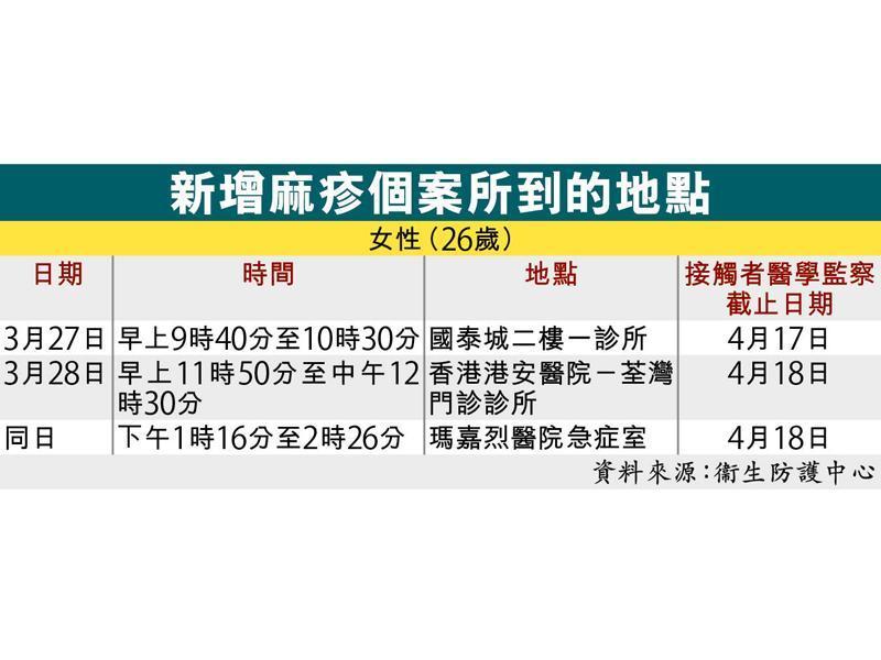 衞生防護中心昨日公布,正調查一宗麻疹確診個案,涉及一名在國泰城工作的26歲女子,她過往健康良好,於本月25日發燒,27日早上曾到國泰城2樓一診所求診,於28日開始出疹,同日上午到過香港港安醫院-荃灣門診診所,中午時分到瑪嘉烈醫院急症室求醫並入院接受治療。病人的呼吸道樣本經檢測後證實對麻疹病毒呈陽性反應,現時情況穩定。