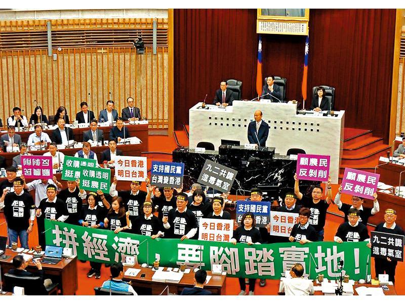 韓國瑜昨日在巿議會還遭到民進黨團的抗議,他大約早上9時抵達市議會,因先前他率團赴大陸城市交流引發賣台爭議,民進黨團議員在韓國瑜上台宣讀施政報告前,就集聚在台前,高舉「今日香港、明日台灣」、「收購透明挺農民」等字牌,還齊聲高呼「拚經濟要腳踏實地」,一度阻擾韓國瑜作報告。