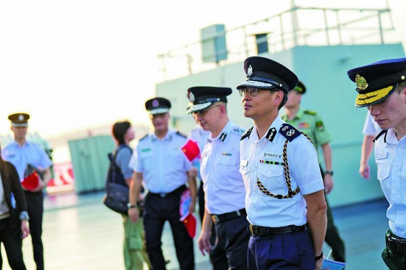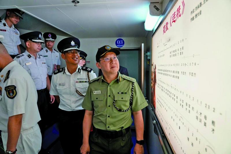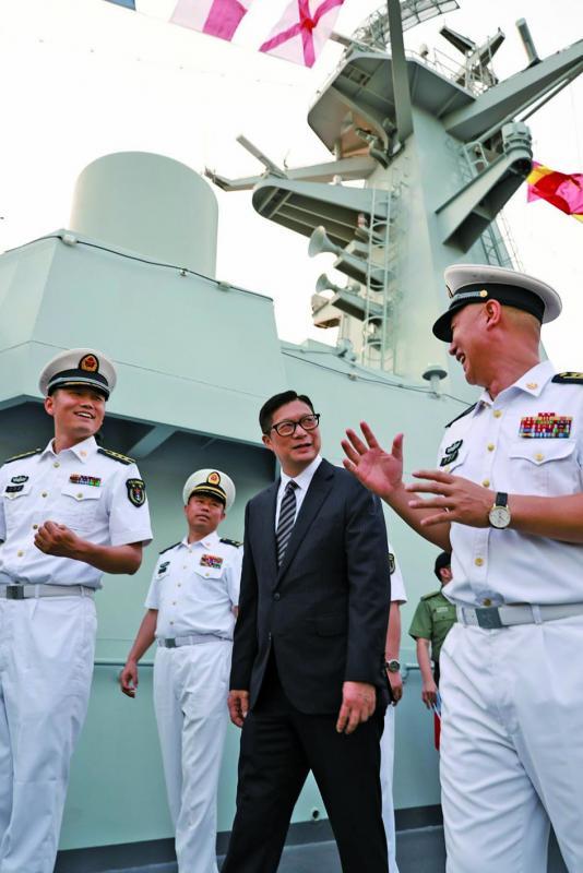 【本報記者報道】解放軍戚繼光艦(舷號83)及沂蒙山艦(舷號988)昨日起訪問香港,保安局局長鄧炳強昨率領眾紀律部隊及輔助部隊的首長級人員登艦參觀。鄧炳強其後在社交平台發帖文稱,深深覺得香港紀律部隊和海軍將士守衛國家海疆一樣,兩者雖然職責不同,但目標一致,都是要築牢國家安全防線。