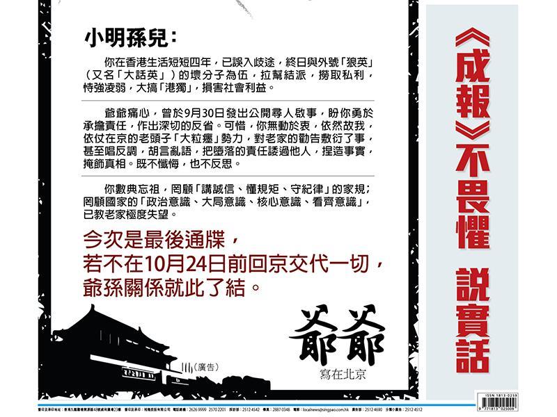 爺爺痛心,曾於9月30日發出公開尋人啟事,盼你勇於承擔責任,作出深切的反省。可惜,你無動於衷,依然故我,依仗在京的老頭子「大粒癦」勢力,對老家的勸告敷衍了事,甚至唱反調,胡言亂語,把墮落的責任諉過他人,捏造事實,掩飾真相。既不懺悔,也不反思。