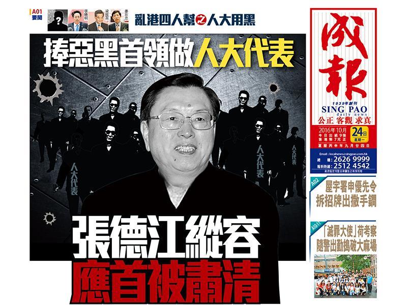 在中央堅決打黑反貪腐之際,張德江主管的全國人大系統不但貪腐嚴重,最令人憤慨是惡黑首領竟然可當人大代表,這把「紅黑保護傘」,在地方欺壓老百姓,操縱政權,搶奪資源。張德江作為中央政治局常委第三號人物,理應遵守政治紀律和政治規矩,可惜他的縱容,令到惡黑腐擴散,買位賄選不時發生。上樑不正下樑歪,甚至禍延香港,有錢人巴結中聯辦,就可討個人大政協名銜,走進內地官場討好處。今天召開「六中全會」,首個要聲討肅清的,肯定是全國人大,已經失去監督,不時攪局,筆者支持國家主席習近平的「全面從嚴治黨」,還社會安寧,還社會進步。