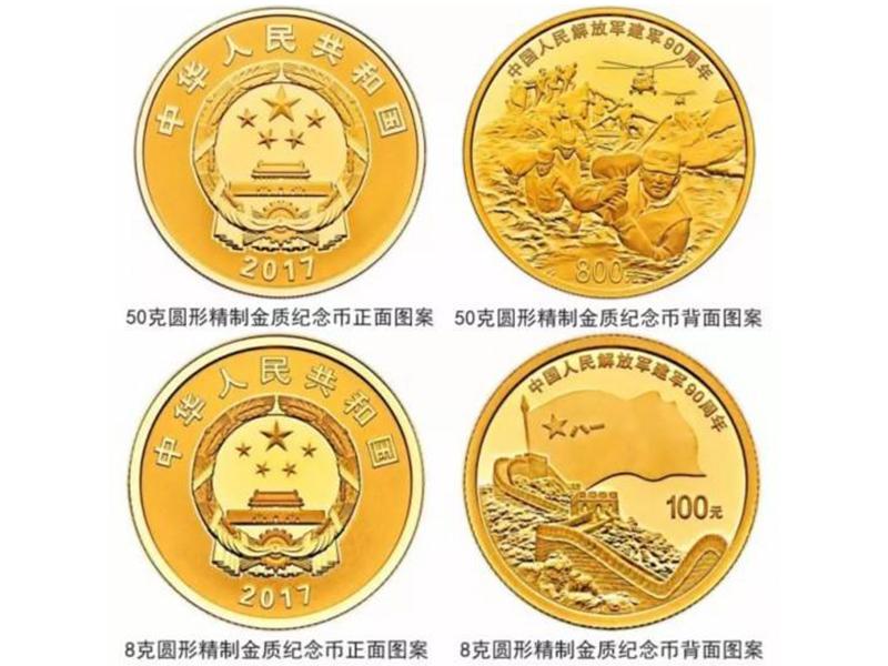 8克圆形金质纪念币背面图案为军旗、长城造型组合设计,并刊「中国人民解放军建军90週年」字样及面额。纪念币含纯金8克,直径22毫米,面额100元,成色99.9%,最大发行量30000枚。