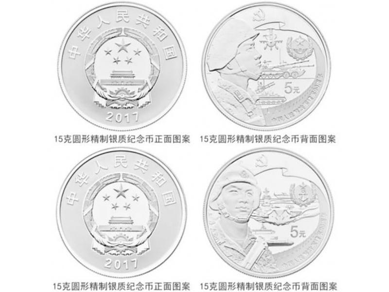15克圆形银质纪念币背面图案之一为党旗下的陆军军人形象配以典型武器装备、军兵种臂章图案、长城造型等组合设计,并刊「中国人民解放军建军90週年」字样及面额;15克圆形银质纪念币均含纯银15克,直径33毫米,面额5元,成色99.9%,最大发行量5×50000枚。