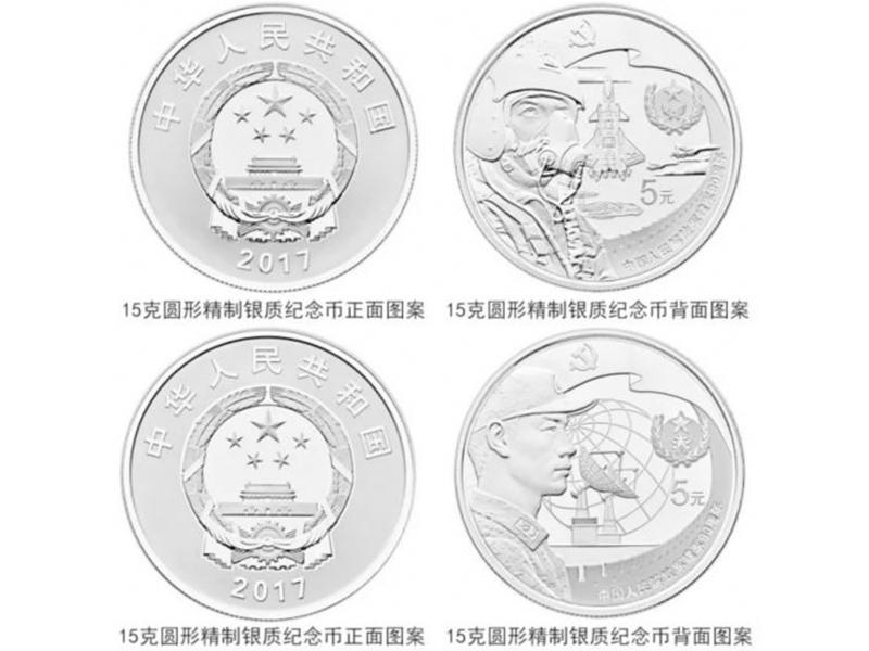 15克圆形银质纪念币背面图案之五为党旗下的战略支援部队军人形象配以典型武器装备、军兵种臂章图案、长城造型等组合设计。