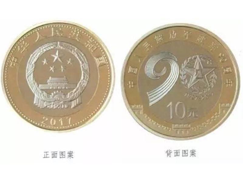 双色铜合金纪念币背面主景图案由飘带、橄榄枝、军徽以及「1927-2017」组成,并蕴含「90」字样;主景图案上方刊「中国人民解放军建军90週年」字样,下方为面额「10元」和长城图案;纪念币面额10元,直径为27毫米,材质为双色铜合金,发行数量为2.5亿枚。