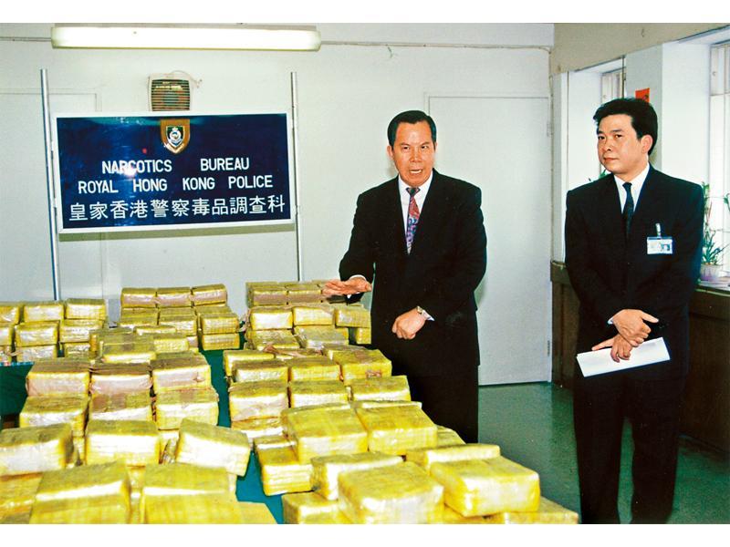時任警務處處長李君夏(左)嘉許毒品調查科的工作。