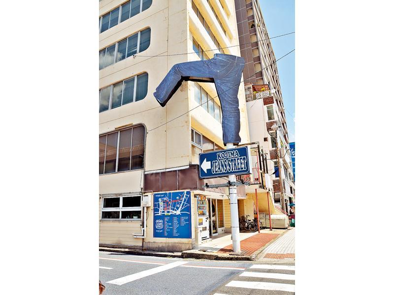 走在匯聚了約30間以牛仔布為主題店舖的牛仔褲街,從頭上、腳下、四周圍,全都是跟牛仔褲有關的擺設,甚至水溝蓋、垃圾桶、燈柱、自動販賣飲料機等等,也被飾上牛仔褲細節或染上牛仔布丹寧色!