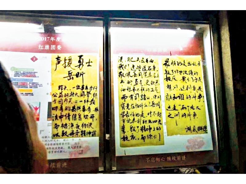 岳昕的遭遇披露后,北大「红旗团委」宣传栏的玻璃上周一晚间出现署名「湖底群魂」的声援大字报,称这是「『两个北大』之间的斗争」,而此次也是自2007年三角地信息栏清拆后,北大多年来再现抗议性大字报。尽管大字报随即被撕去,但照片已在网路流传。民运人士王丹在facebook上转贴大字报,称「中国年轻世代,终将登上政治舞台」。